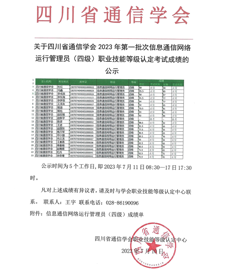 关于四川省通信学会2023年第一批次信息通信网络运行管理员(四级)职业技能等级认定考试成绩的 公示