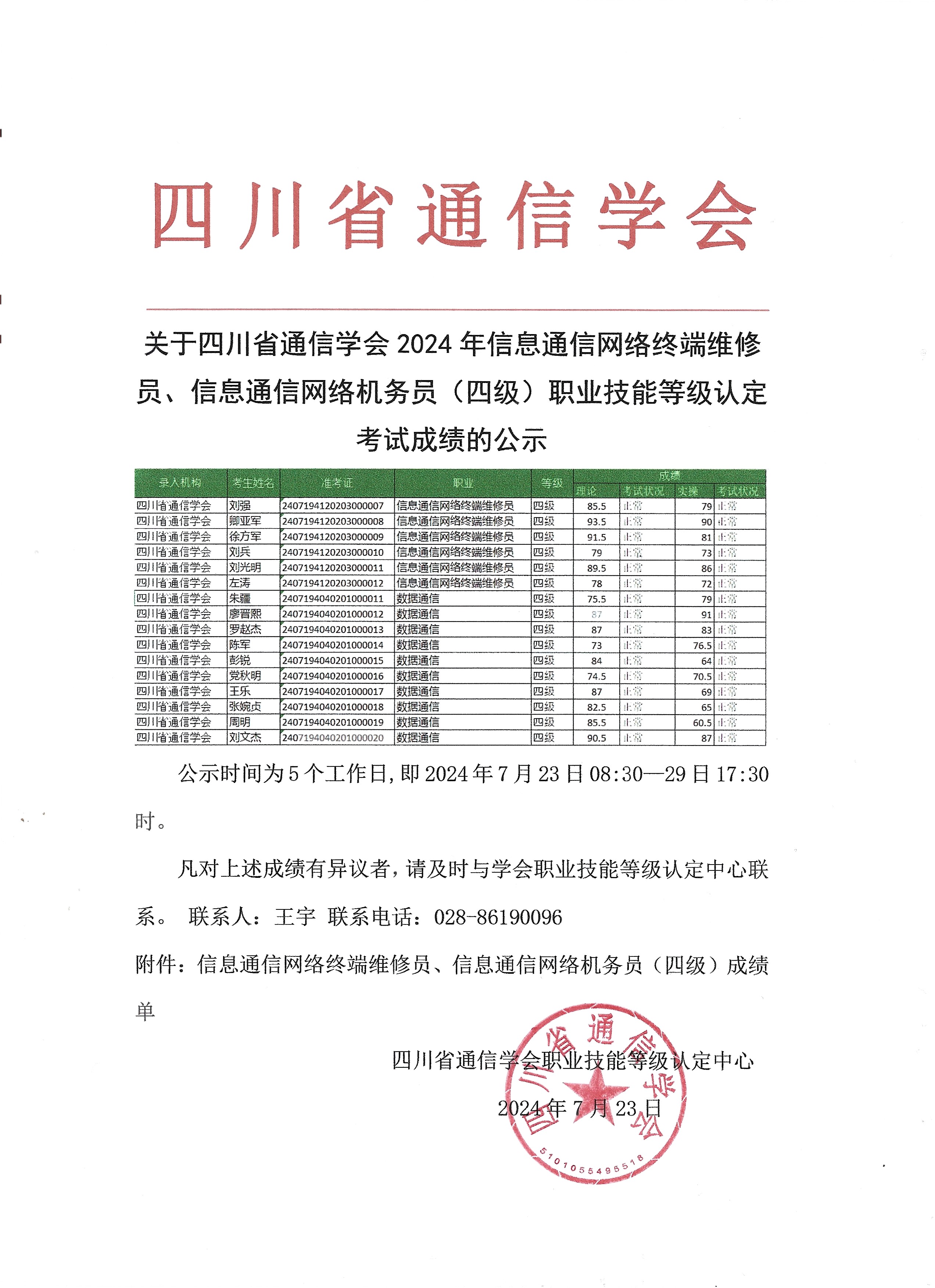 2024年信息通信网络终端维修员、信息通信网络机务员职业技能等级认定考试成绩的公示