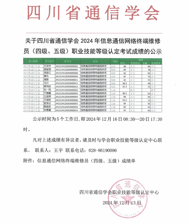 关于四川省通信学会2024年信息通信网络终端维修员(四级、五级)职业技能等级认定考试成绩的公示