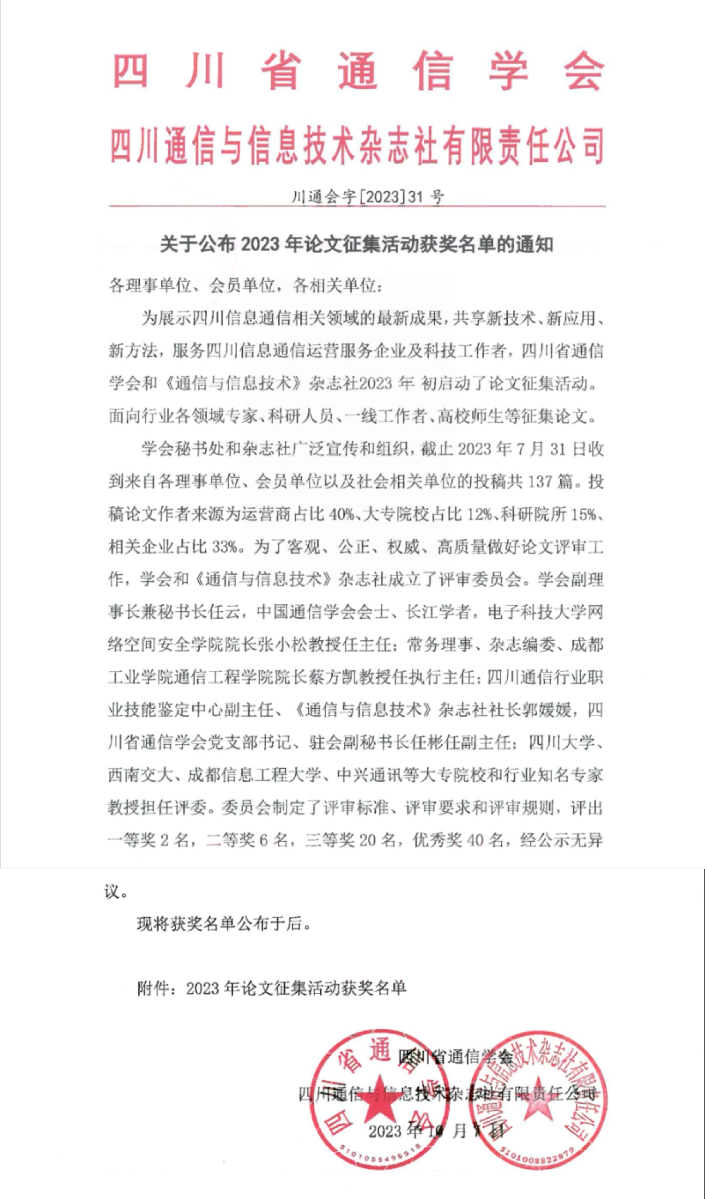 经广泛宣传和组织,收到来自各理事单位、会员单位以及社会相关单位的投稿共137篇。投稿论文作者来源为运营商占比40%、大专院校占比12%、科研院所15%、相关企业占比33%。为了客观、公正、权威、高质量做好论文评审工作,学会和《通信与信息技术》杂志社成立了评审委员会。学会副理事长兼秘书长任云,中国通信学会会士、长江学者,电子科技大学网络空间安全学院院长张小松教授任主任;常务理事、杂志编委、成都工业学院通信工程学院院长蔡方凯教授任执行主任;四川通信行业职业技能鉴定中心副主任、《通信与信息技术》杂志社社长郭媛媛,四川省通信学会党支部书记、驻会副秘书长任彬任副主任;四川大学、西南交大、成都信息工程大学、中兴通讯等大专院校和行业知名专家教授担任评委。委员会制定了评审标准、评审要求和评审规则,评出一等奖2名,二等奖6名,三等奖20名,优秀奖40名,经公示无异议。现予发布。
