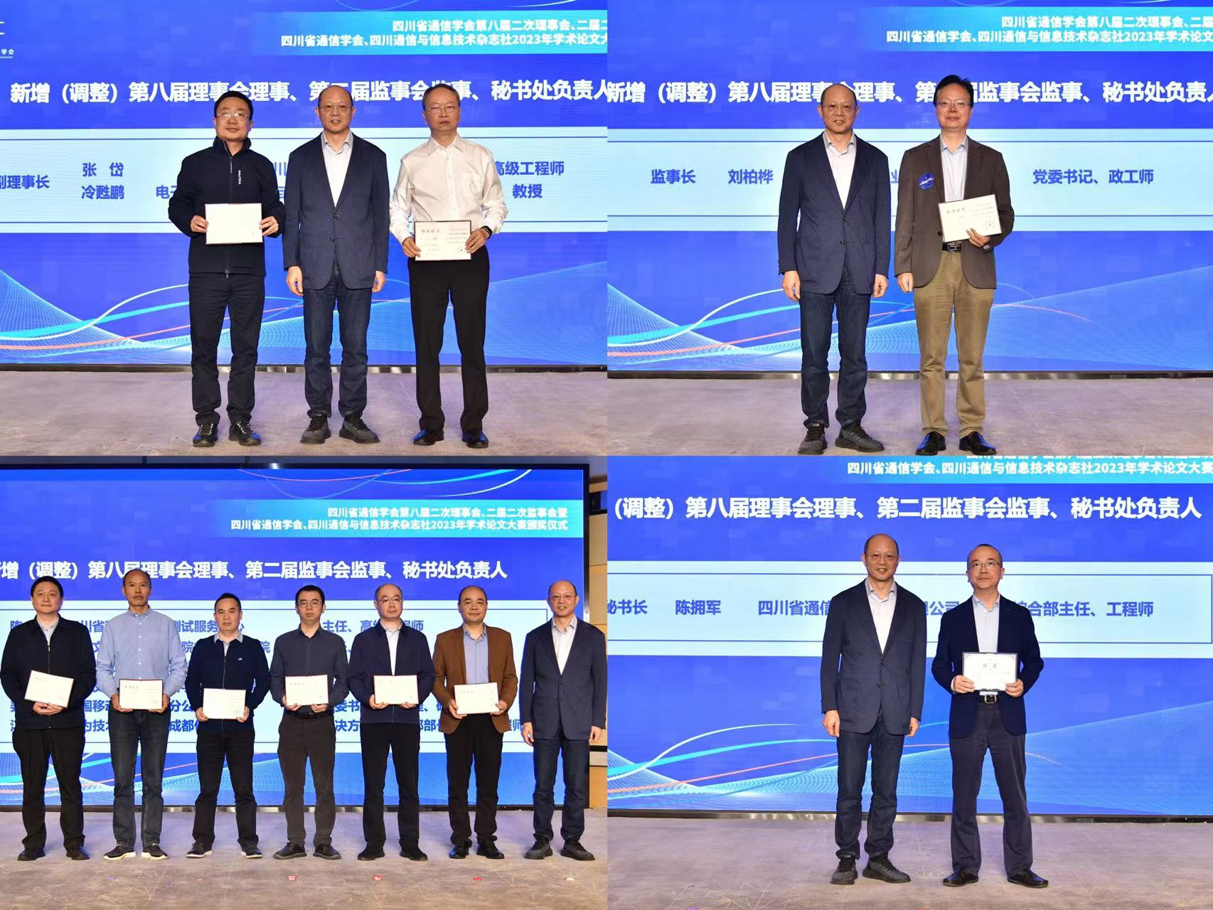 选举通过张岱(中国铁塔四川省公司副总经理/高级工程师)、冷甦鹏(电子科技大学信息与通信工程学院党委书记/教授)为第八届理事会副理事长,刘柏桦(四川邮电职业技术学院党委书记/政工师)为第二届监事会监事长,陈钢(四川省科技厅分析测试服务中心主任/高级工程师)、罗环敏(四川文化产业职业学院文化信息学院院长/教授)、王真文(四川长江职业学院智能工程学院院长/教授)、叶佳(西南交通大学信息科学与技术学院通信系主任/教授)、姜凌(中国移动通信达州分公司党委书记、总经理/硕士)、江松(华为技术有限公司成都代表处解决方案部销售部部长/高级工程师)为第八届理事会理事,增补陈拥军(四川省通信产业服务有限公司综合部主任/工程师)为副秘书长。