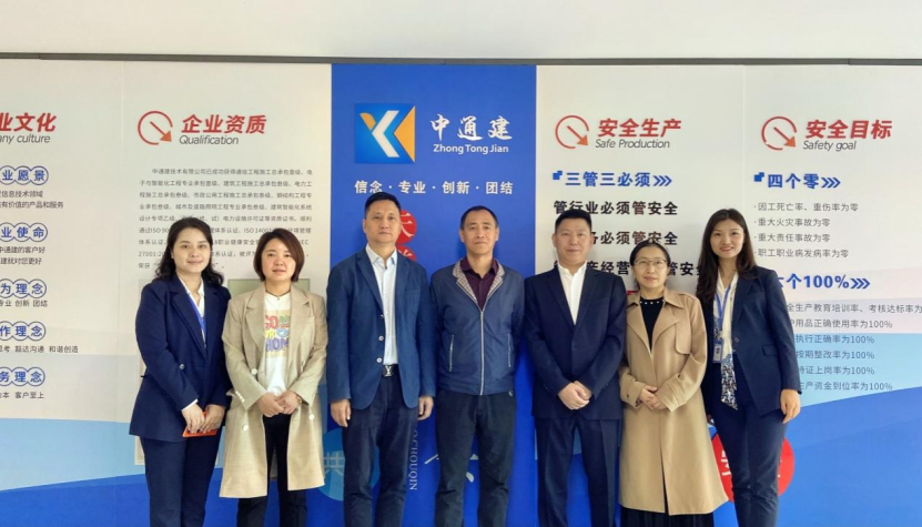 调研期间,在中通建技术有限公司总经理曹琳、总经理助理李艳陪同下参观了中通建技术有限公司办公区域,浏览文化墙建设,并与公司管理人员、员工亲切交流。