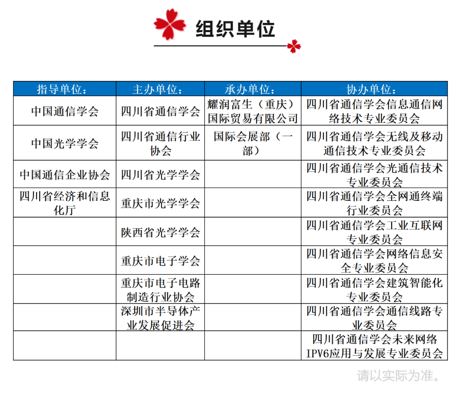大会以“展研结合”的风格,将同期举办:2024第二届中国西部通信产业创新发展论坛2024第23届中国国际(西部)光电产业博览会2024西部全球芯片与半导体产业博览会2024中国国际(西部)智能电子博览会2024中国国际(西部)广播电视信息网络博览会 大会将邀请行业专家、企业家代表及学会和协会代表等嘉宾,通过论坛、技术研讨、新品(技术)发布、采购对接会等丰富大会内容,同时吸引更多专业人士参与。