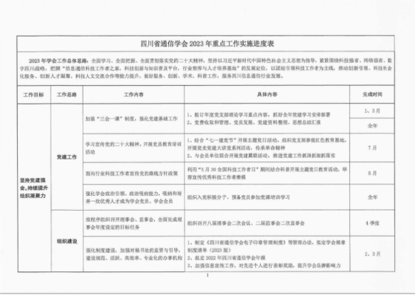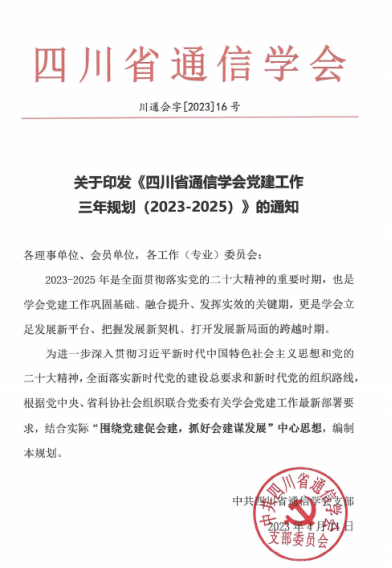 4月11日,四川省通信学会发布2023-2025年党建工作三年规划,提出重要任务是:政治建设摆首位,提高政治能力;强化政治引领,抓好思想教育;提升人才培养能力,建设高素质队伍;发挥战斗堡垒作用,建强基层组织。