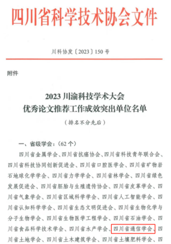 12月5日,在重庆市科学技术协会、四川省科学技术协会2023年成渝科学技术大会上,四川省通信学会再次荣获“2023川渝一流学会”,同时被评选为“2023川渝科技学术大会优秀论文推荐工作成效突出单位”。