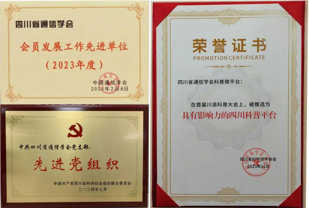 党建强会,科技创新,“党建信联”主题实践活动的蓬勃开展,推动了学会工作的全面发展。四川省通信学会社会知晓、认同、美誉度上升,工作得到主管、指导单位肯定,得到广大会员单位和会员好评。2022、2023年连续两年获得重庆市科协、四川省科协授予“川渝一流学会”称号, “2023川渝科技学术大会优秀论文推荐工作成效突出单位”,2019年以来连续五年荣获中国通信学会“会员发展工作先进单位”,牵头校会联姻申报的教学实践项目获“四川省政府一等奖”、教育部“国家级教学成果二等奖”, 四川省通信学会微信公号在首届川渝科普大会上被授予“具有影响力的四川科普平台”;中共四川省通信学会党支部在2022年、2024年先后获得中共四川省科协社会组织联合委员会“先进党组织”荣誉,支部书记和多名党员荣获“优秀党支部书记”、“优秀党务工作者”、“优秀共产党员”称号。