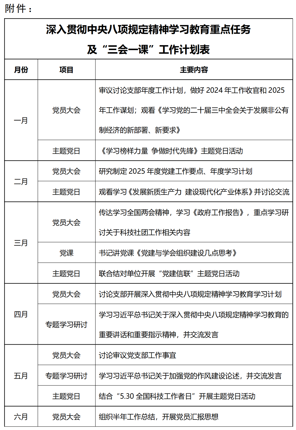 为加强学会党建工作,强化政治引领,四川省通信学会根据省通信管理局和省科协社团党委总体安排部署,制定发布《2025年党建工作要点》和深入贯彻中央八项规定精神学习教育重点任务及“三会一课”工作计划表,要求学会党员、积极分子和秘书处工作人员全员行动起来,积极参与,推动党建和会建目标同向、部署同步、工作同力,确保学会健康规范发展。