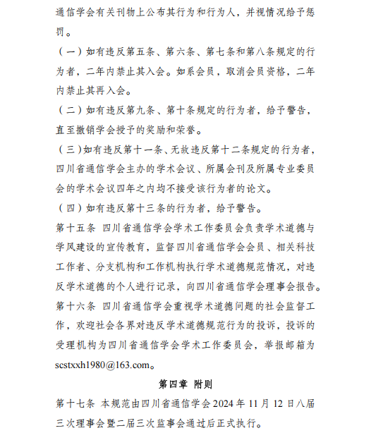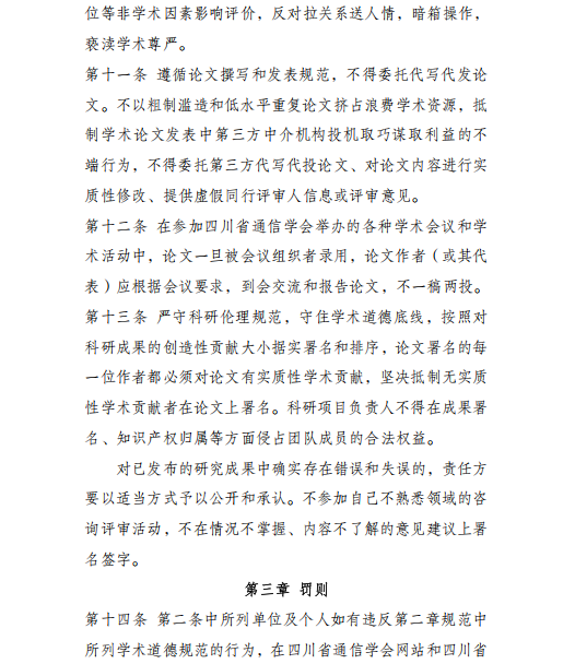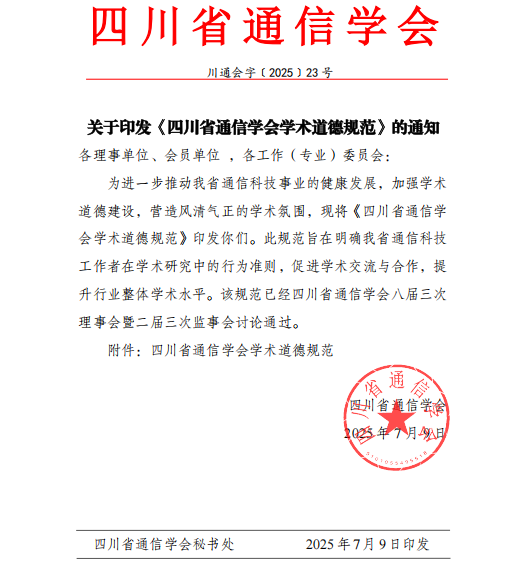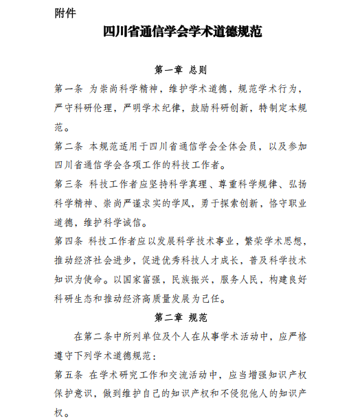 为深入贯彻落实国家关于加强科研诚信与学风建设的部署要求,进一步推动我省信息通信行业科技事业持续、健康、高质量发展,营造清朗健康的学术生态,四川省通信学会正式发布《四川省通信学会学术道德规范》。