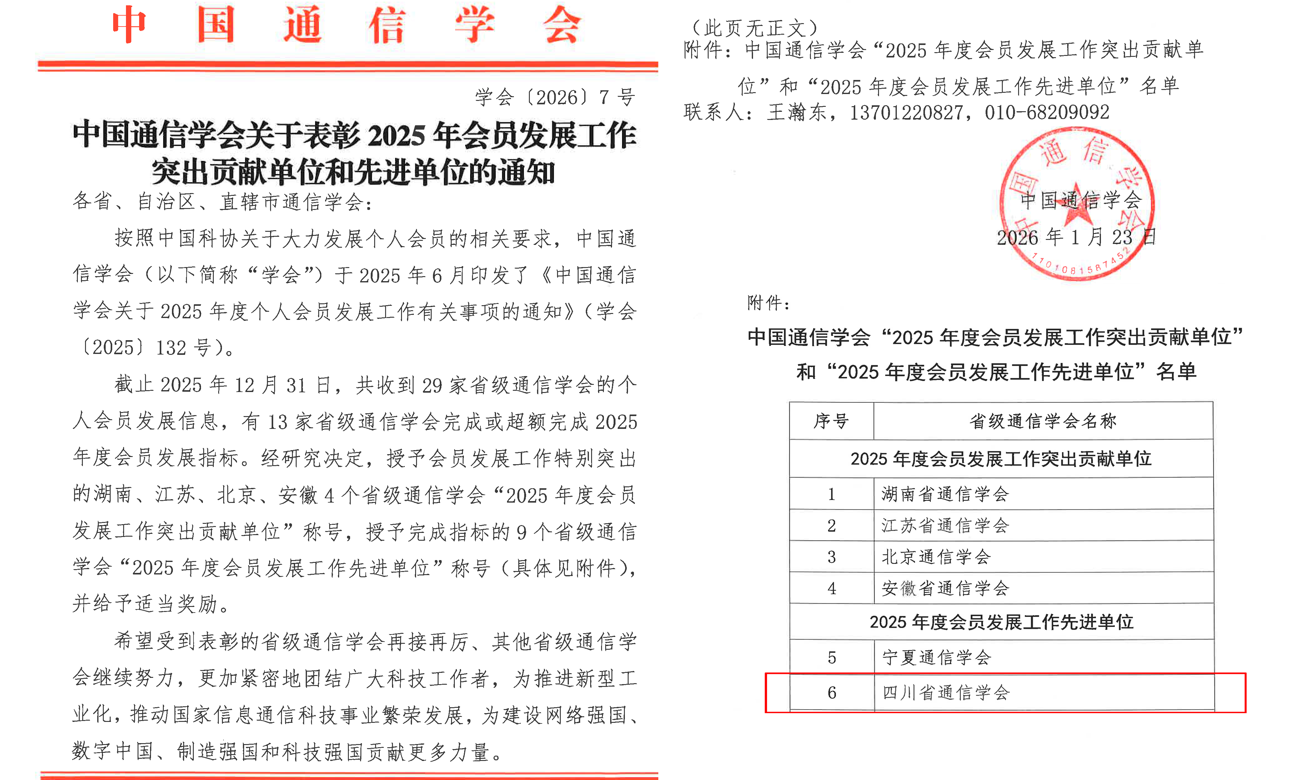 近日,中国通信学会印发《关于表彰2025年会员发展工作突出贡献单位和先进单位的通知》(学会〔2026〕7号),四川省通信学会荣获“2025年度会员发展工作先进单位”称号,这也是学会连续第七年获此殊荣。