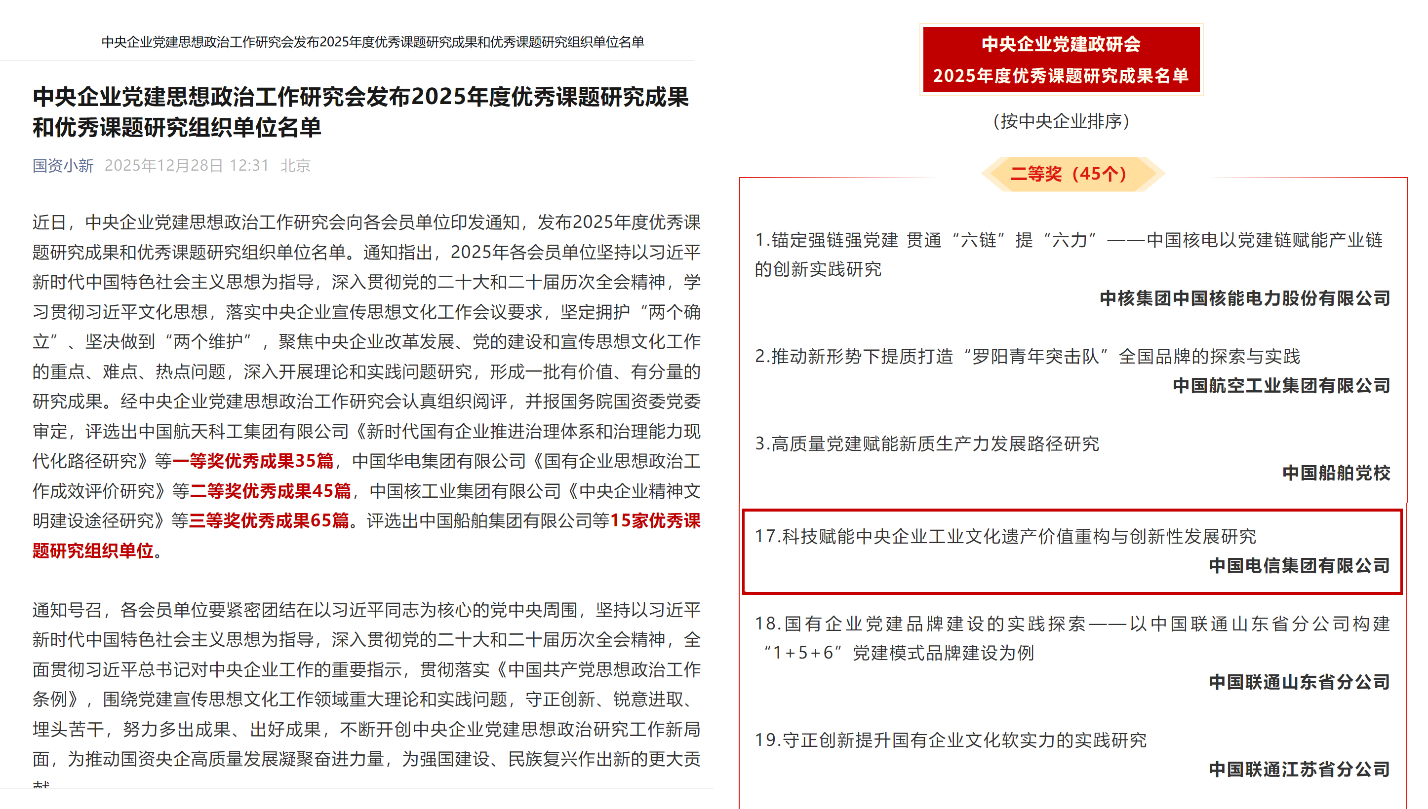 近日,国务院国资委公布中央企业党建思想政治工作研究会2025 年度优秀课题研究成果名单,理事长单位中国电信四川公司以集团名义申报的课题《科技赋能中央企业工业文化遗产价值重构与创新性发展研究》获评二等奖优秀成果。