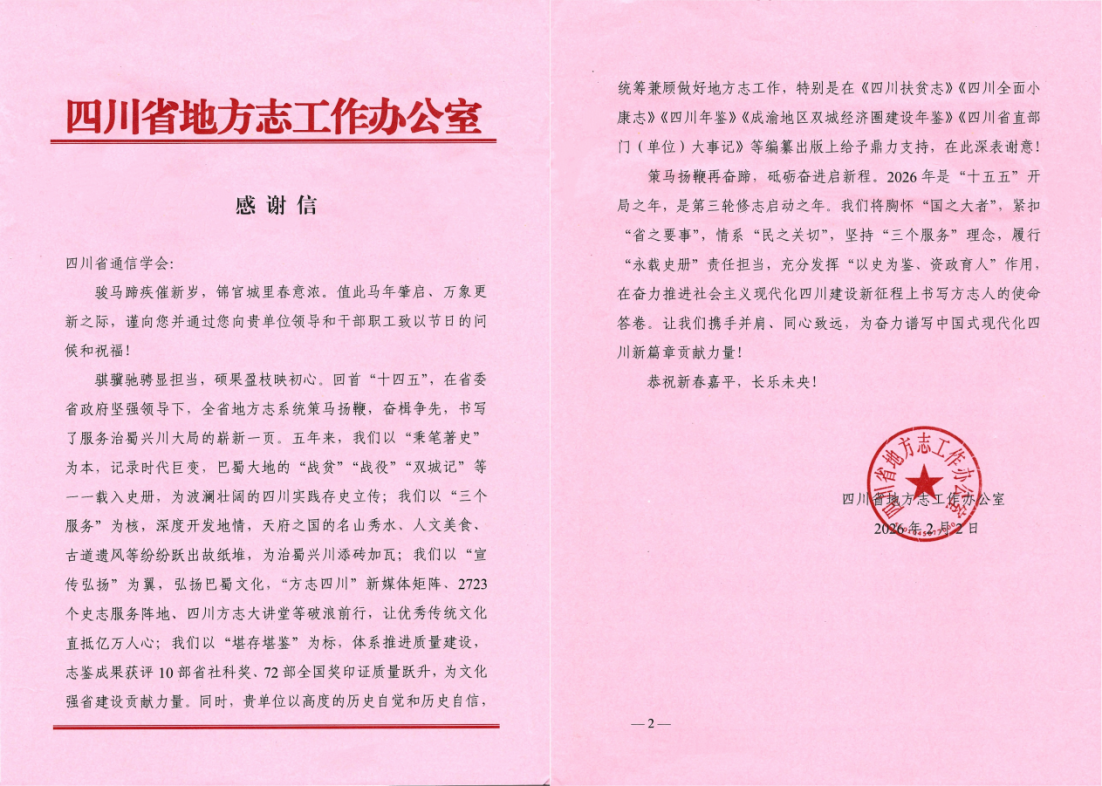 近日,四川省通信学会收到四川省地方志工作办公室发来的感谢信。信中对学会积极支持、全力配合《四川省直部门(单位)大事记(2024)》等编纂出版工作表示衷心感谢,并充分肯定学会在记录行业发展、服务全省大局中作出的积极贡献。